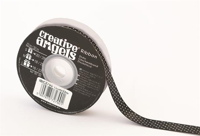 Saténová stuha, 15 mm x 22 m, čierna s bielymi bodkami