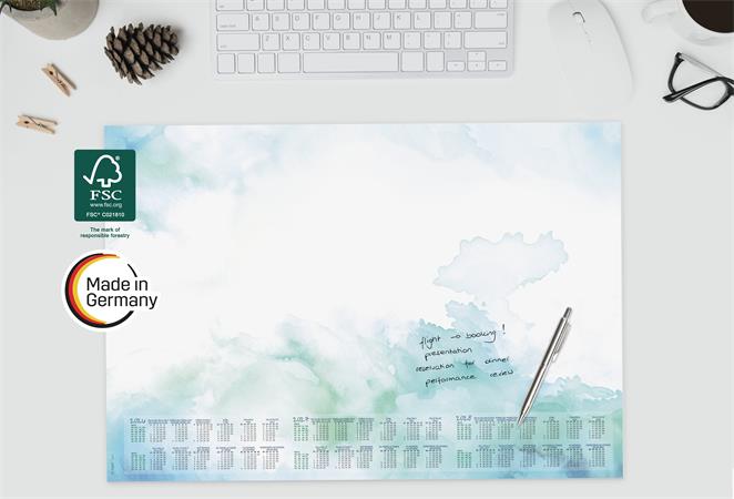 s trojročným kalendárom (2026/2027/2028) -s týždenným plánovačom -štvorjazyčný: angličtina, nemčina, francúzština a holandčina -veľkosť: približne A2 -odolný, protišmykový a vďaka masívnej kartónovej zadnej doske úplne rovno leží -použiteľný aj ako podložka pod myš -30 listov -farba: zelená, modrá -s certifikátom FSC