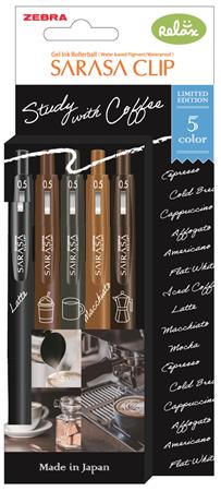 Gélové pero, 0,33 mm, stláčací mechanizmus, ZEBRA "Sarasa Study with Coffee", 5 rôznych farieb