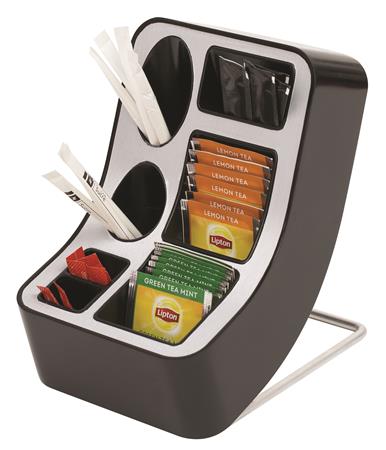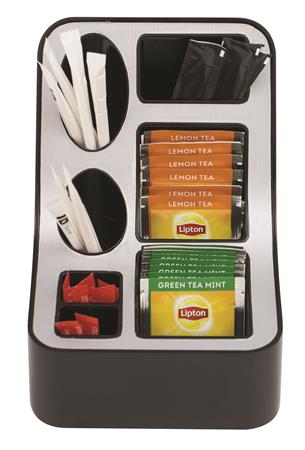 Moderný, funkčný ponukový stojan na čaj so 6 priehradkami. 2 väčšie priehradky sú vhodné na uloženie čajových filtrov, 4 menšie priehradky na cukor