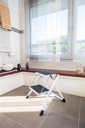 Ľahký a kompaktný oceľový schodík s praktickou rukoväťou na prenášanie a uvoľňovacím tlačidlom. Dva veľké stupne s protišmykovou úpravou zaisťujú bezpečný výstup a stabilitu. Jednoducho skladovateľný: v zloženom stave má hĺbku iba 40 mm. 2 veľké stupne s rozmermi 300 x 200 mm s protišmykovým povrchom. Bezpečnostný zámok s uvoľňovacím tlačidlom. Praktická rukoväť na prenášanie.  Protišmykové plastové nožičky. Nosnosť: 150 kg. Pracovná výška: 2,45 m