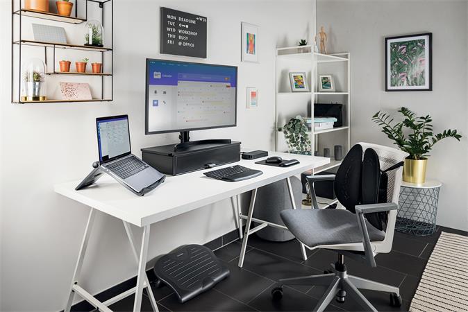 Pre hybridných zamestnancov, ktorí hľadajú prenosné ergonomické riešenie, ako aj pre organizácie požadujúce udržateľné riešenia, je stojan na notebook SmartFit® Easy Riser™ EQ ideálnou voľbou. Tento stojan zlepšuje ergonómiu pracovných staníc a prispieva k efektívnejšej práci. Vyrobený je z 50 % z materiálov recyklovaných po spotrebe (PCR), čím pomáha znižovať náš vplyv na životné prostredie. Patentovaný systém SmartFit® umožňuje nastaviť výšku a sklon obrazovky notebooku na zmiernenie záťaže chrbta, krku a očí. Podporuje prúdenie vzduchu, čím zlepšuje výkon batérie, a pri cestovaní ho možno zložiť na plochý tvar.