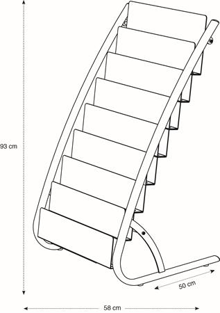Škandinávsky štýl, čistý dizajn s kombináciou materiálov dreva a ocele. Ideálne na vystavenie časopisov alebo brožúr, napríklad na recepcii. - pevná konštrukcia, stabilný kovový stojan - so zaťaženou základňou - 8x2 priehradky na uloženie dokumentov A4 (24 x 32 cm) - výška: 93 cm - šírka: 58 cm - hĺbka: 50 cm - hĺbka priehradiek: 4 cm - upevňovacia sada potrebná na montáž je súčasťou balenia